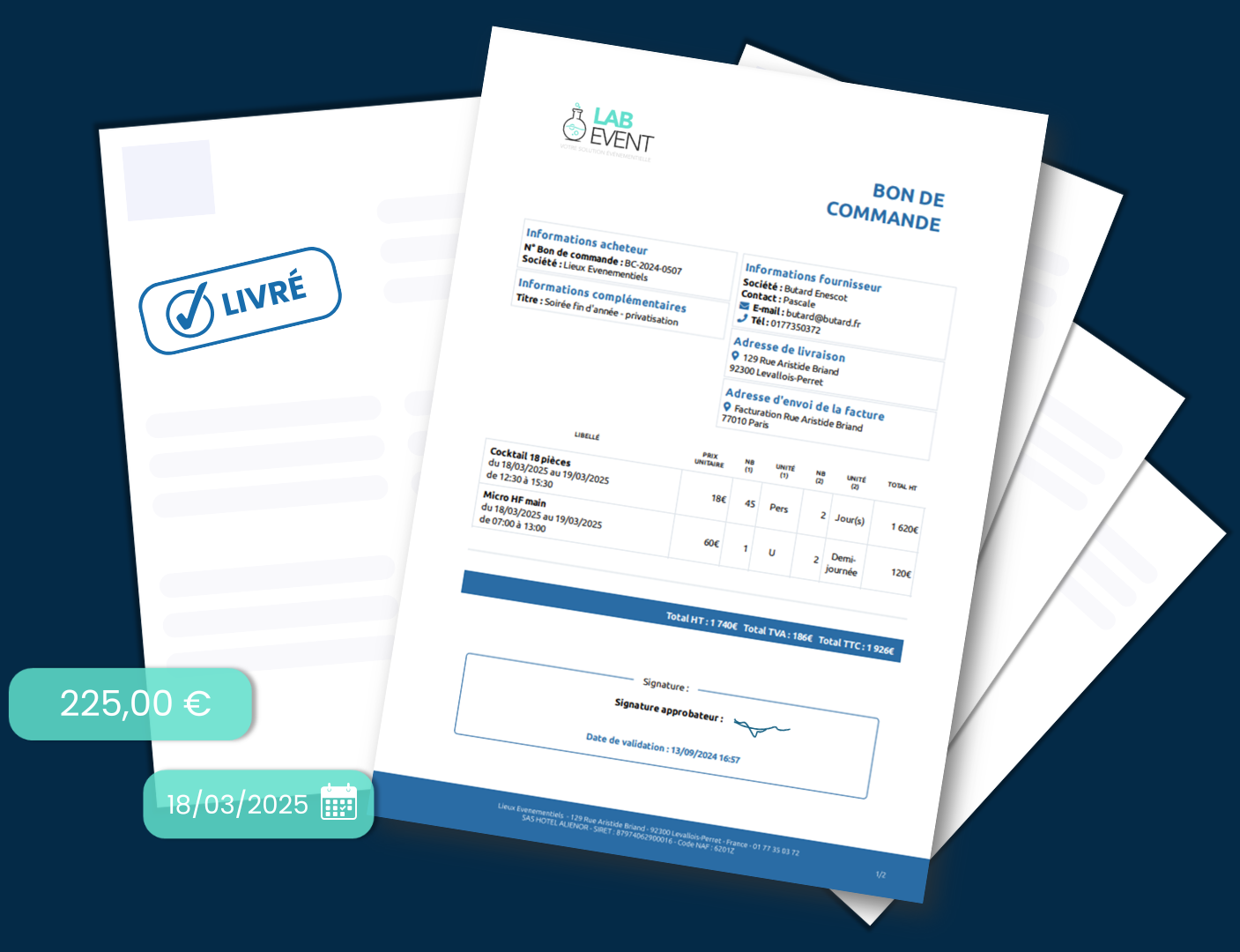 Tout se fait depuis votre interface Lab Event : création, envoi, suivi des factures clients et prestataires. Moins d’erreurs, moins de ressaisies, moins de retards. Vous gagnez en productivité et en fiabilité.