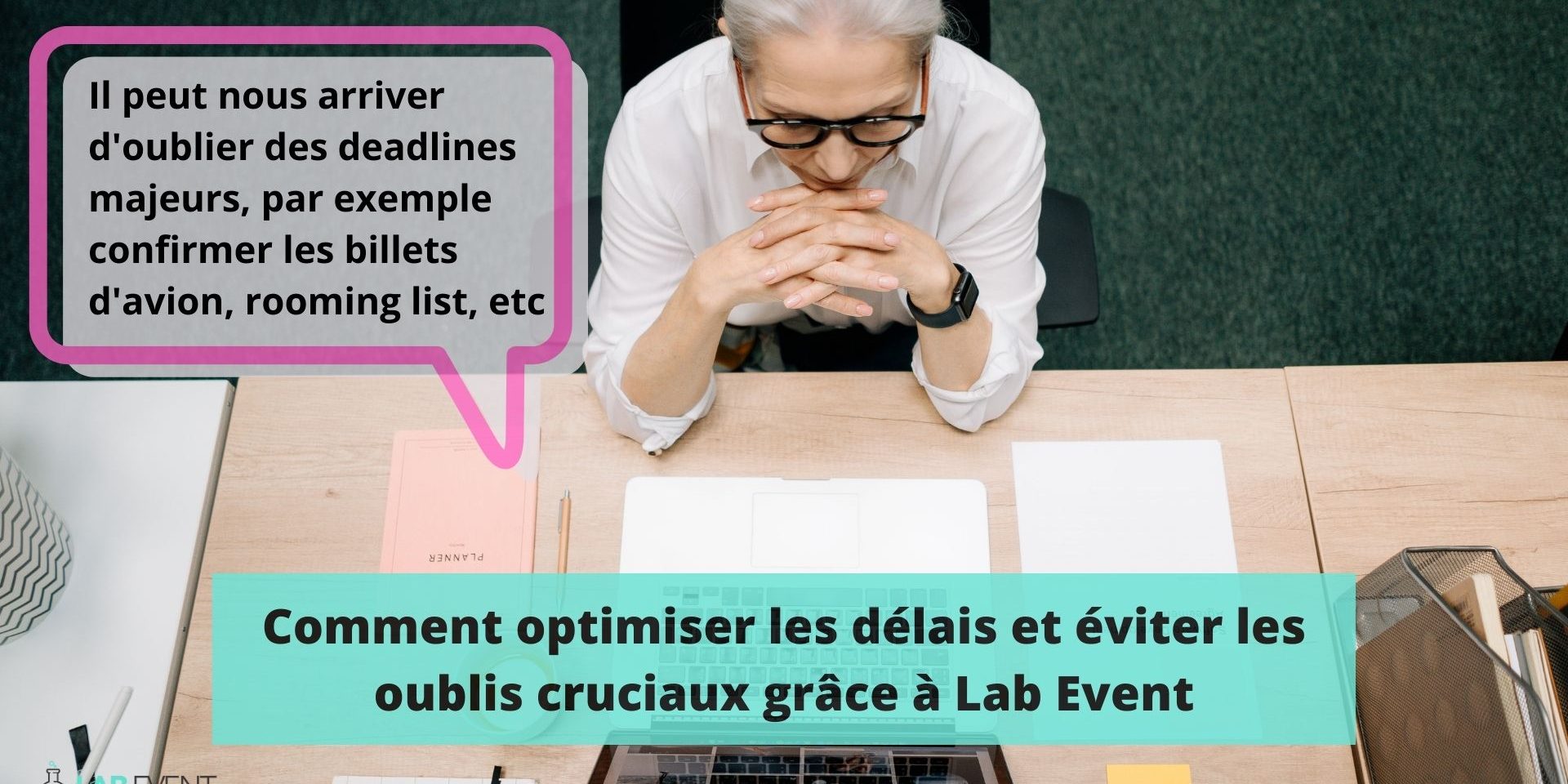 Dans le tumulte incessant de l’industrie événementielle, où chaque instant compte et où les moindres détails ont un impact considérable, il n’est pas rare que des échéances cruciales échappent à votre vigilance. Des éléments vitaux tels que l’élaboration de la liste des salles, la confirmation des billets d’avion, etc peuvent parfois se retrouver négligés, entraînant des conséquences potentiellement désastreuses pour la réussite de vos événements. Découvrez comment Lab Event peut être votre allié incontournable pour optimiser vos délais, éviter les oublis et garantir le succès de chaque projet événementiel.