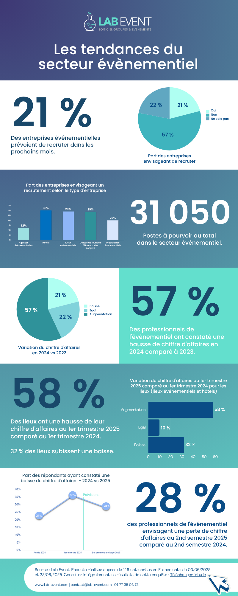 Le secteur événementiel continue de se remettre du choc de la pandémie, avec une croissance plus modérée et des recrutements concentrés sur les acteurs les mieux établis. Pour découvrir tous les chiffres, analyses et tendances, accédez à l’étude complète : Étude annuelle du secteur événementiel – Juin 2025